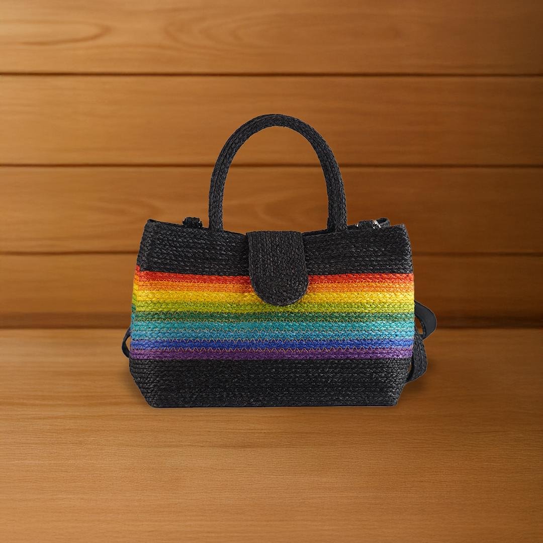 กระเป๋าป่านศรนารายณ์ทรงแฟชั่นขนาดเล็ก มาพร้อมหูหิ้วสั้นและฝาปิดแม่เหล็ก ใช้งานสะดวก ดีไซน์ทันสมัยด้วยลวดลายหลากสีที่สดใส ถักทอด้วยมือจากเส้นใยธรรมชาติ เหมาะสำหรับใส่ของใช้ส่วนตัวในทุกวัน ผสมผสานความเรียบง่ายกับสไตล์ได้อย่างลงตัว