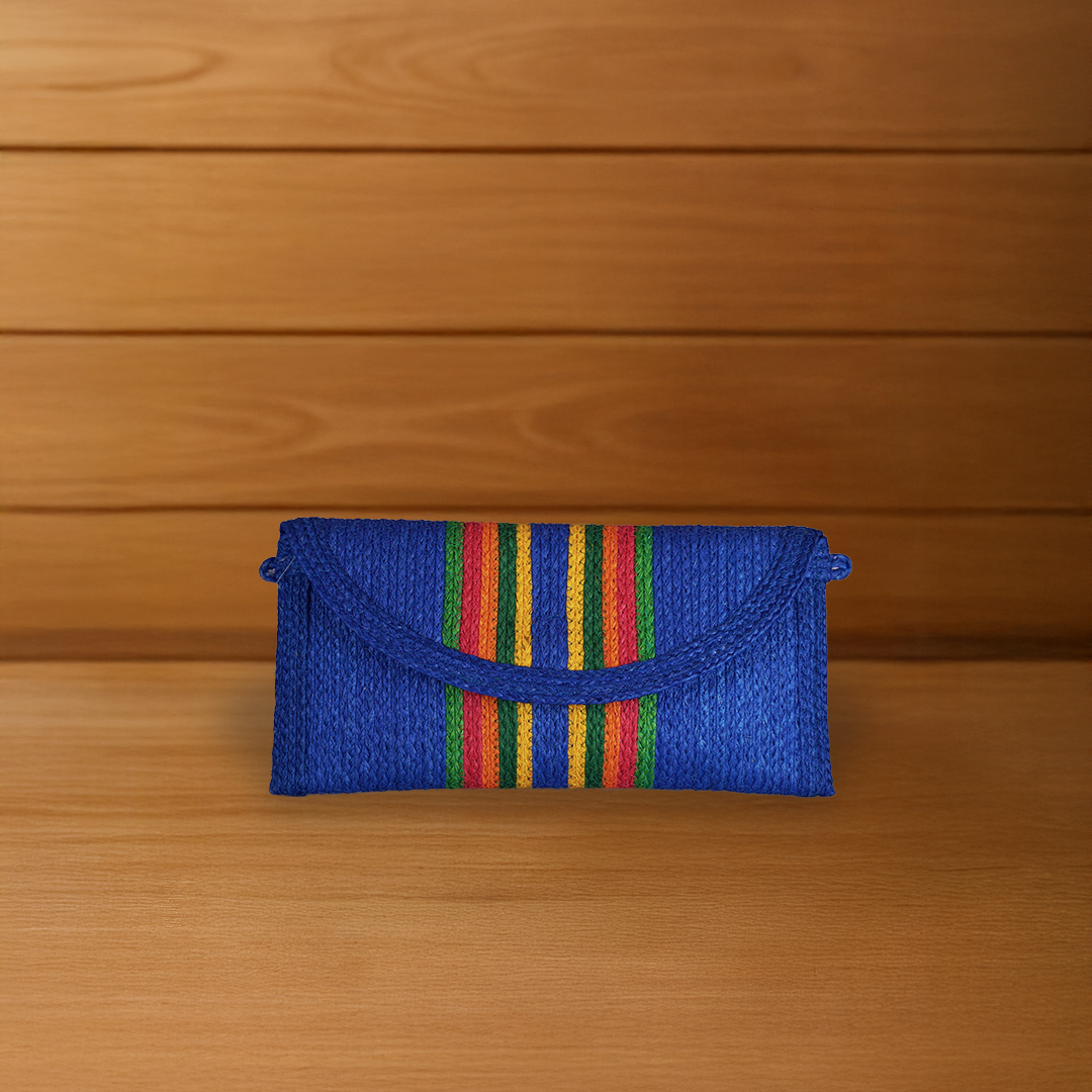This 10-inch clutch is crafted from natural sansevieria fiber, featuring vibrant rainbow stripes on a natural base. Designed with a curved flap and magnetic or snap closure, it’s ideal for daily essentials like cash, phone, or personal items — perfect for everyday use or special occasions.