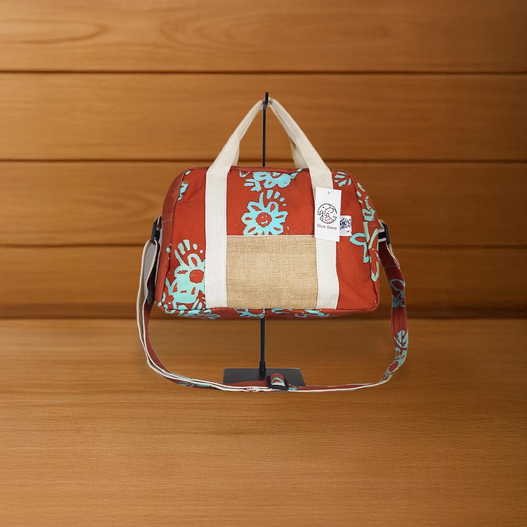 A contemporary handmade bag crafted from hand-dyed cotton or canvas, featuring vibrant batik patterns in orange, blue, and brown—evoking Southern Thai nature. Its modern square shape and wide base offer ample space, while the shoulder strap and handle ensure convenience for travel or everyday use.