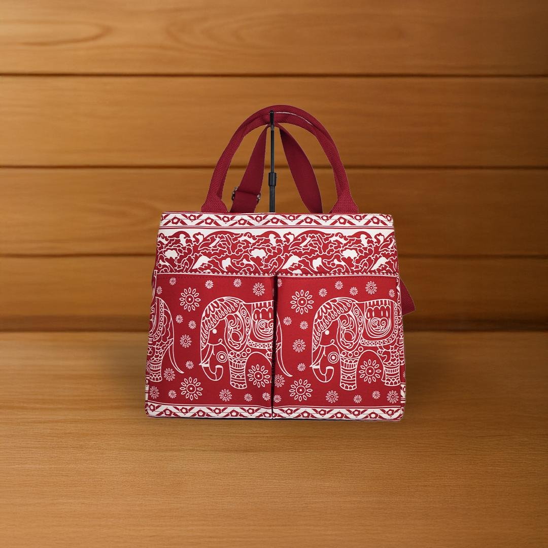 This medium-to-large rectangular fabric bag features a double-zipper design for easy organization. Decorated with vibrant red tones and traditional Thai elephant and floral motifs, it blends cultural charm with modern convenience.