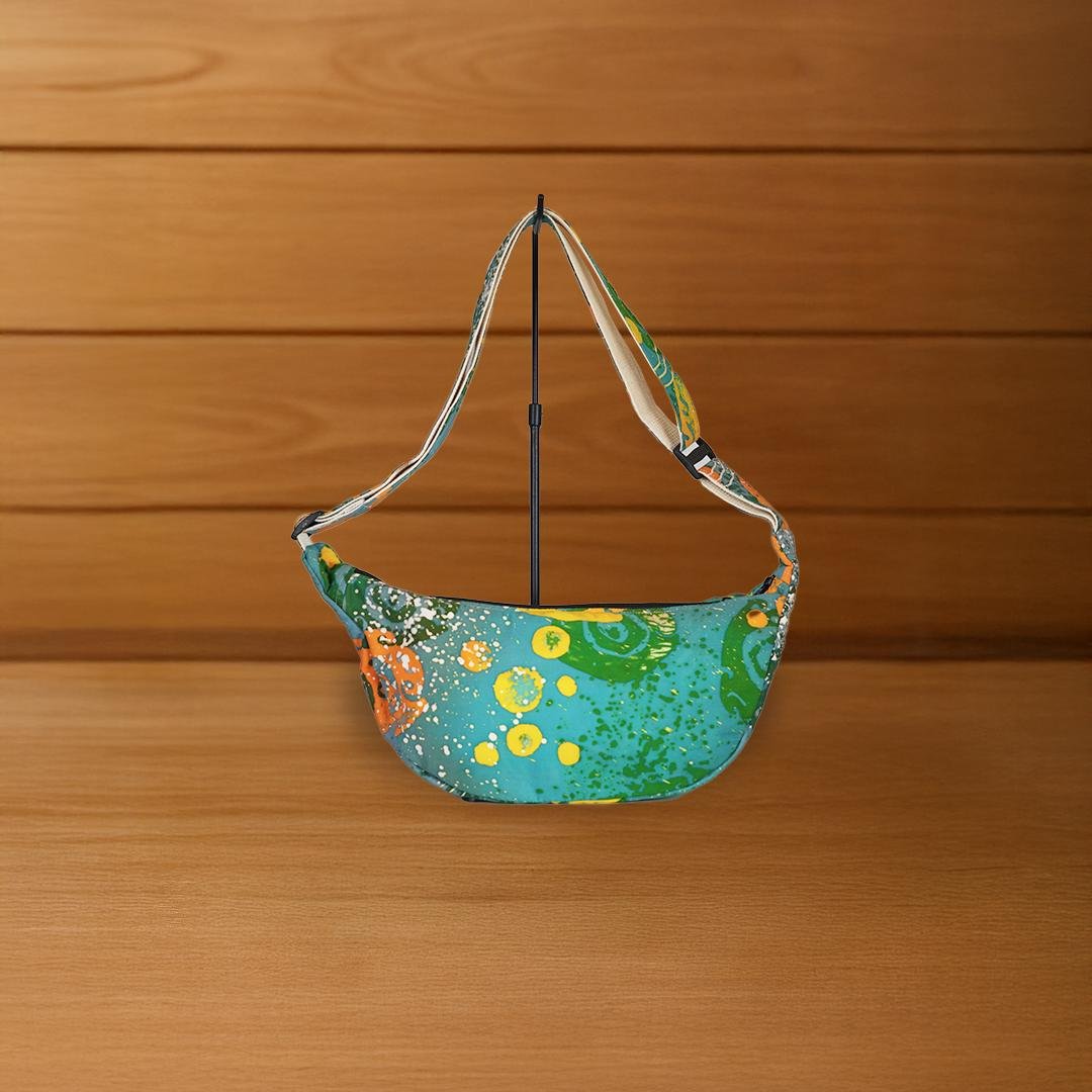 A contemporary handcrafted bag made from hand-dyed cotton or canvas, featuring vibrant local patterns in shades of green, orange, and yellow—echoing the lively spirit of Southern Thai life.