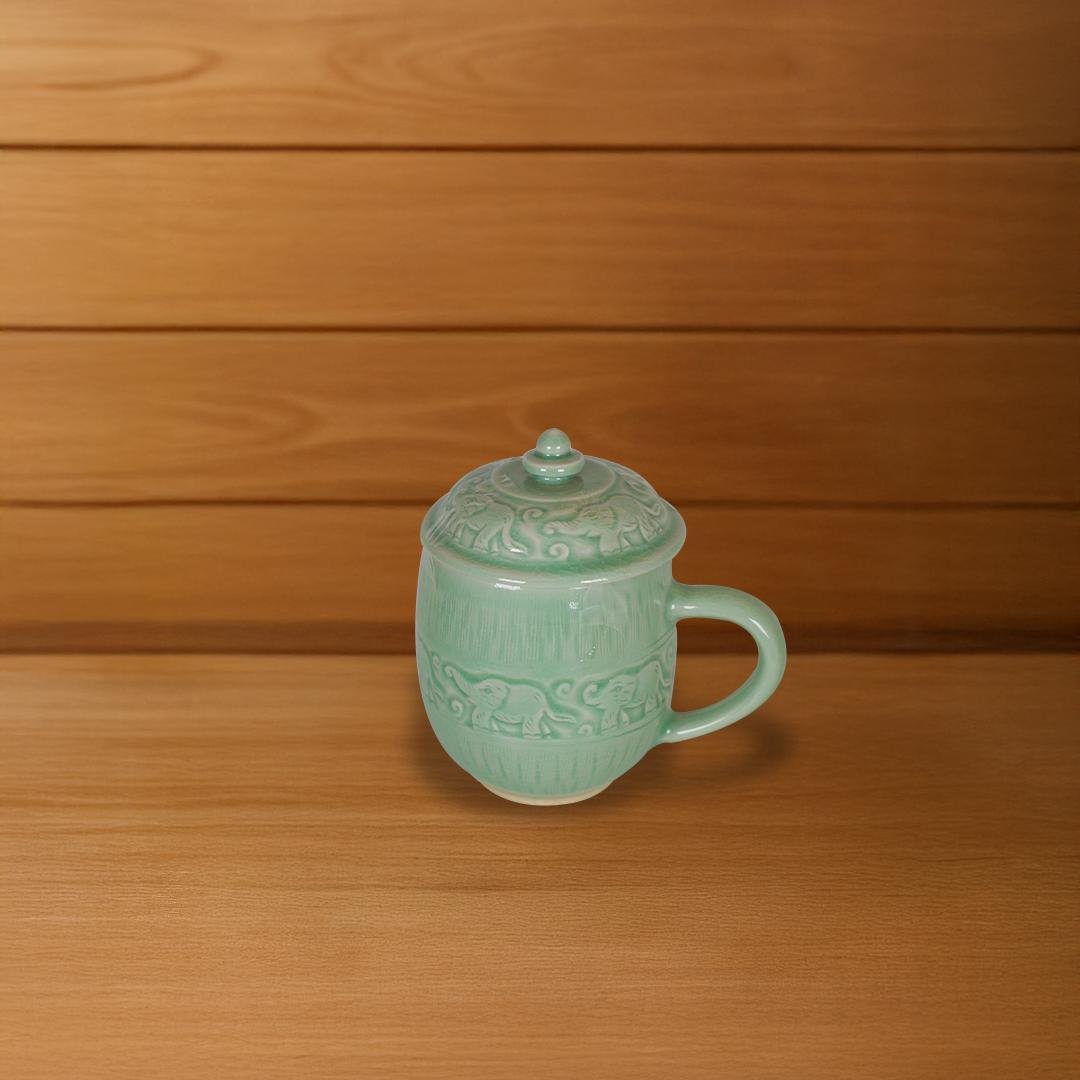 A high-quality ceramic mug with a lid, crafted by Celadon, a renowned Thai brand specializing in traditional Northern Thai pottery.